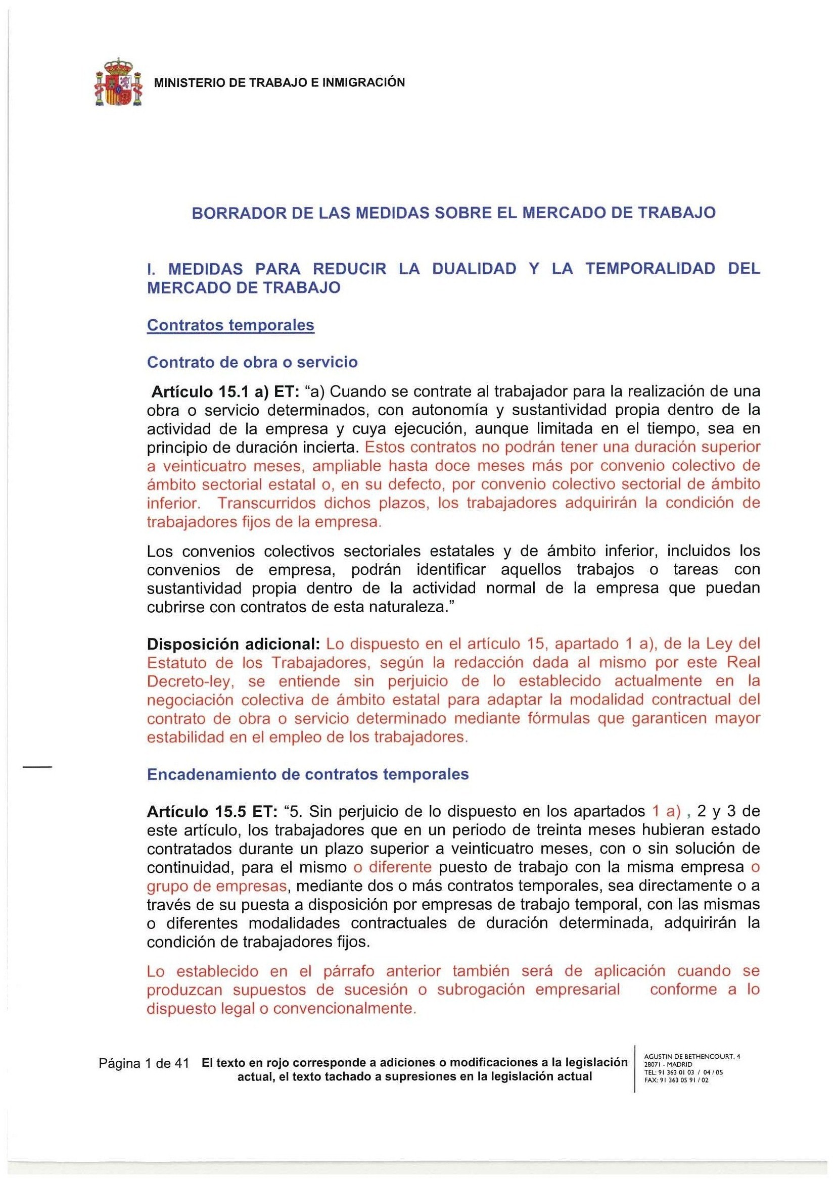 Por otro lado, el documento recoge las propuestas sobre contratación temporal, que pasan por realizar conversiones de contratos temporales en una misma empresa a contratos de fomento del empleo indefinido.